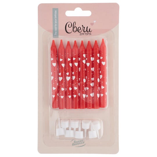 Свечи Белые сердечки Красный 8см 8шт с держат.