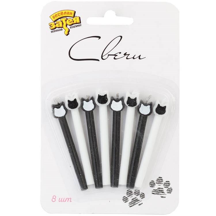 Декоративное украшение праздничного стола. Черные и белые свечи с Котиками. Отличное решение для декорирования торта, десерта ко Дню рождения. Парафин, оригинальный дизайн. Высота свечей 6см, в упаковке 8 штук без подставок. Коллекция Котики.